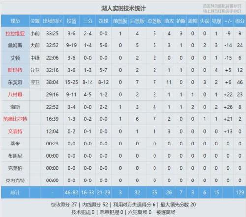三节打完,湖人104-89已经领先到15分。东契奇前三节19中12,砍下37分6篮板10助攻。八村塁前三节8中7得到17分,正负值+26全队最高。第四节公牛外线手感下降,前10次三分出手只进2个,比赛最后3分钟,湖人仍然领先9分。 海斯快攻玩起胯下扣篮,公牛被打懵了。最后1分钟垃圾时间,公牛主场球迷高喊:“我们要布朗尼”,但湖人并没有让布朗尼上场。全场结束,湖人129-118战胜公牛。克内克特跌出轮换,今天1分钟都没打,他上次出战还是1月19日。 今天西部第4的火箭也赢球了,湖人继续排名西部第5。东契奇25投15中,三分14中8,罚球12中8,狂砍46分7篮板11助攻。詹姆斯24分5板3助,下半场投篮4中0,依靠罚球拿到4分。八村塁替补出战29分钟,11中9得到23分2板。